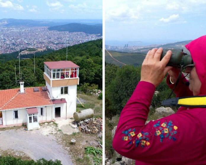 Ayda Teyze, boynunda dürbünü, elinde oyası ve kulağı telsizde; gözetleme kulesinde şehrin kalabalığından uzak bir yaşam sürüyor.
