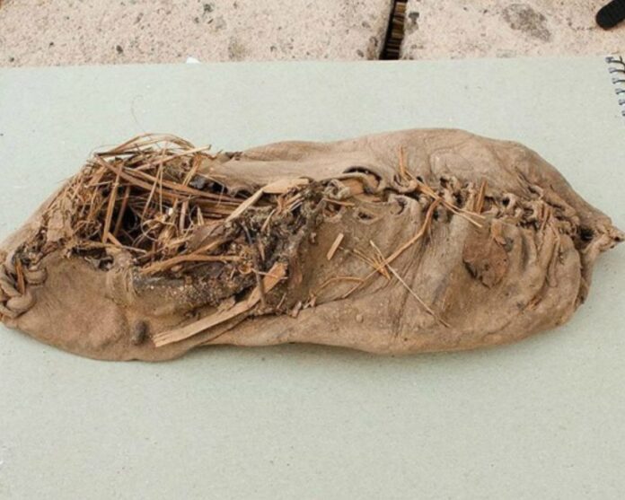 Bir öküz derisinden yapılmış bu ayakkabı çiftinin sağ teki, Ermenistan’daki bir mağarada bulundu.