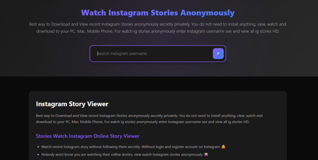 Storieswatch.com, Instagram hesaplarına giriş yapmadan ya da üyelik oluşturmadan anonim bir şekilde gizli instagram hikaye izlemenizi sağlar. Platformu bilgisayarınızdan ya da cep telefonunuzdan kolayca kullanabilirsiniz. Storieswatch.com ile Instagram story izlemek için şu adımları takip edin: